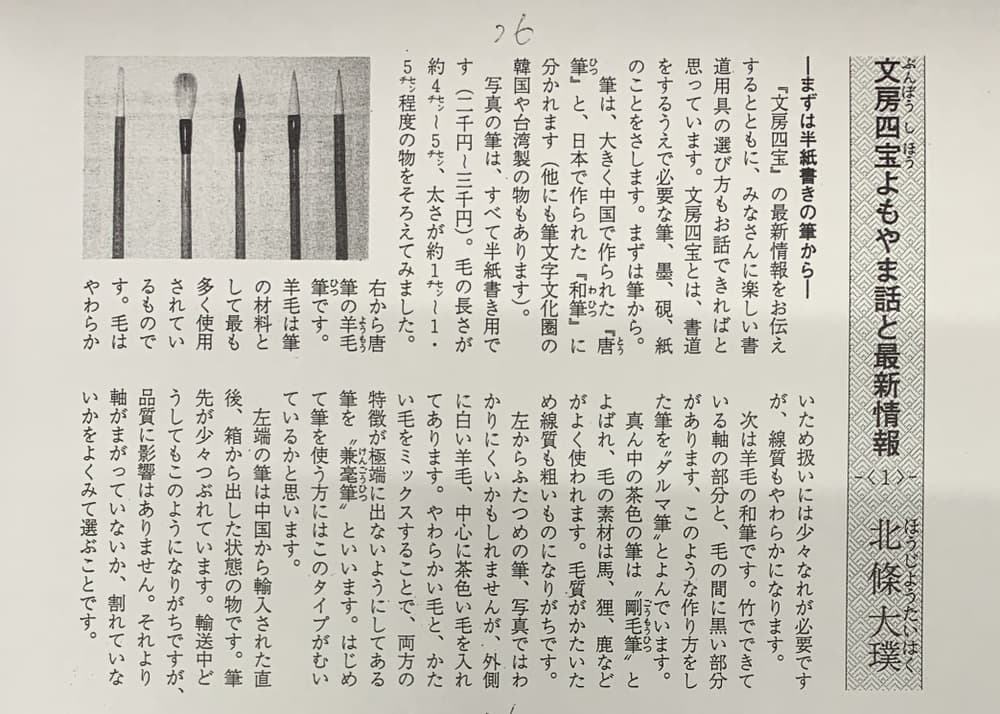 「北條 お前の文章からはどうにか読んで欲しいと祈るような気持ちが伝わってこない」と。平成11年1月「学生書源」に代わり「みなもと」を発刊するという企画の元、用具のコーナーを担当することになり、原稿をお持ちした際の事です。後日書き直しをお持ちした際には「北條 俺は巻頭言を購読者の半分が読んでくれないかと祈って書いてるんや」とも。いつもやさしい先生の厳しい言葉とお許しが出ない状況に「どうしたものかと」悩んでいても、初めての締切日は近づいてきます。行き詰る中「読んでもらえないなら見てもらおう」と写真を入れてお持ちしました。先生は「これでええ」と喜んで下さいました「北條 読んでもらえんような文章は書いたらあかん」とも。その後「書源」にページを頂き、まさかこんなに長く書かせていただけると思「っていなかった頃の出来事です(写真1、2)。
