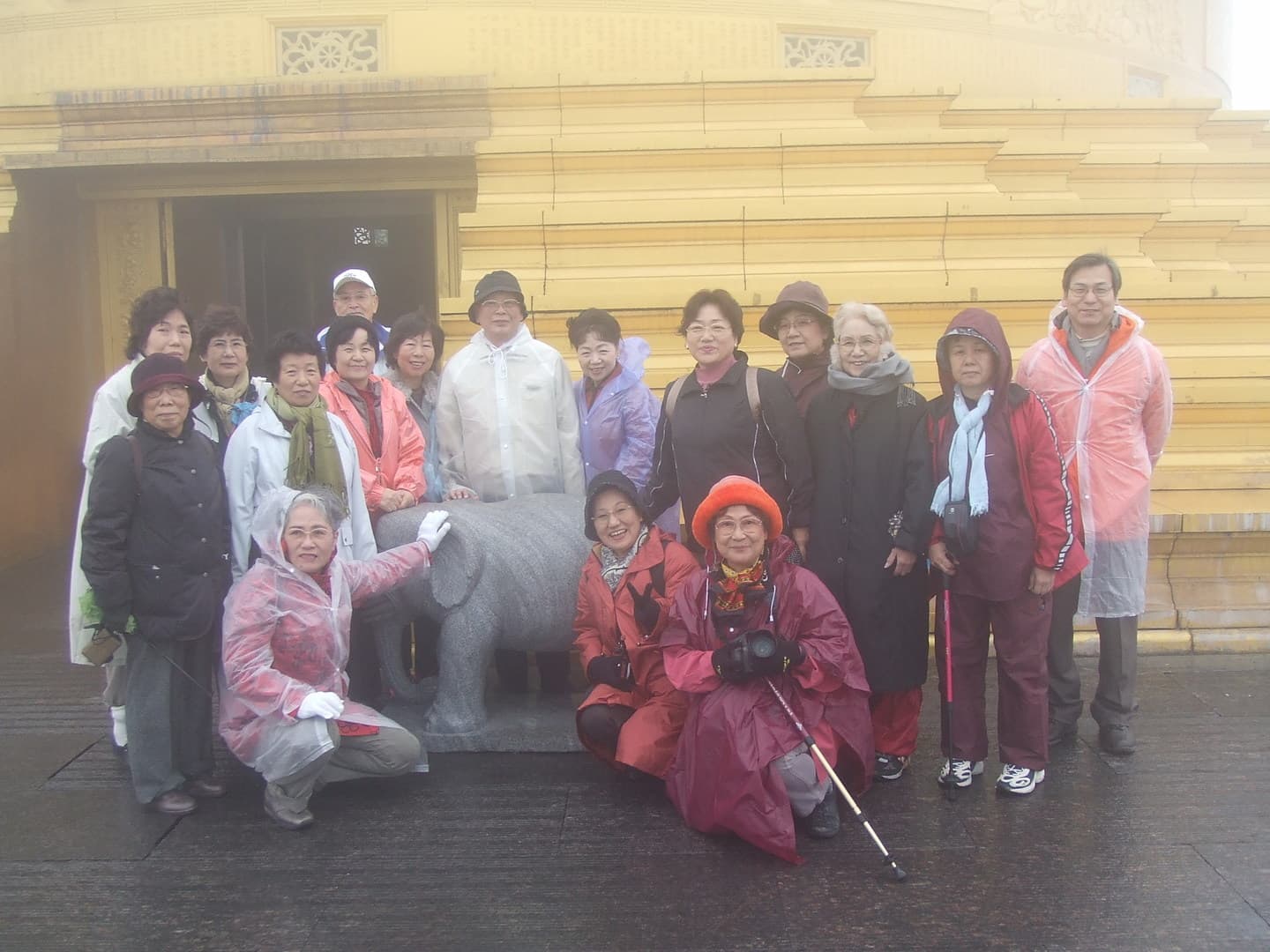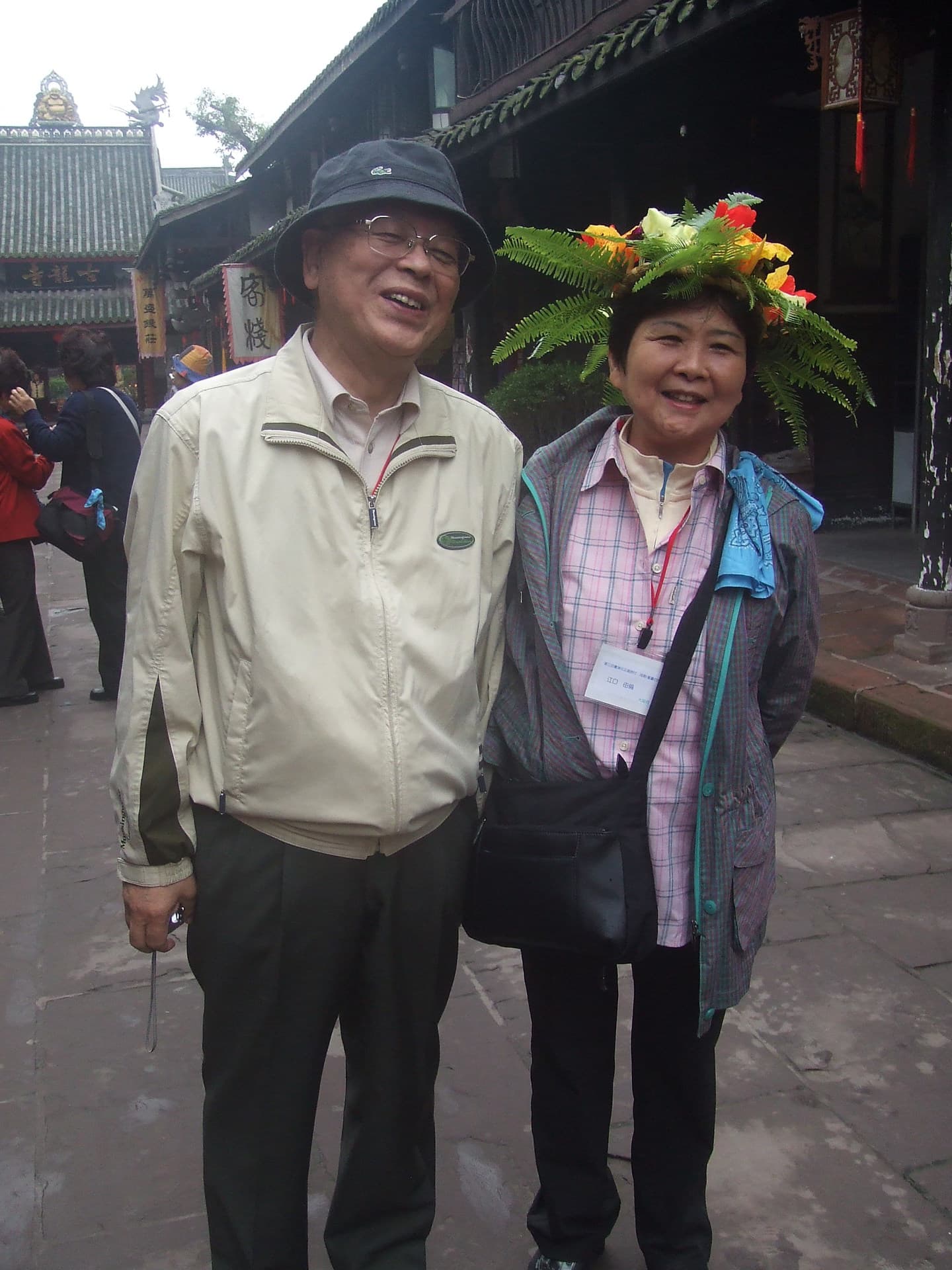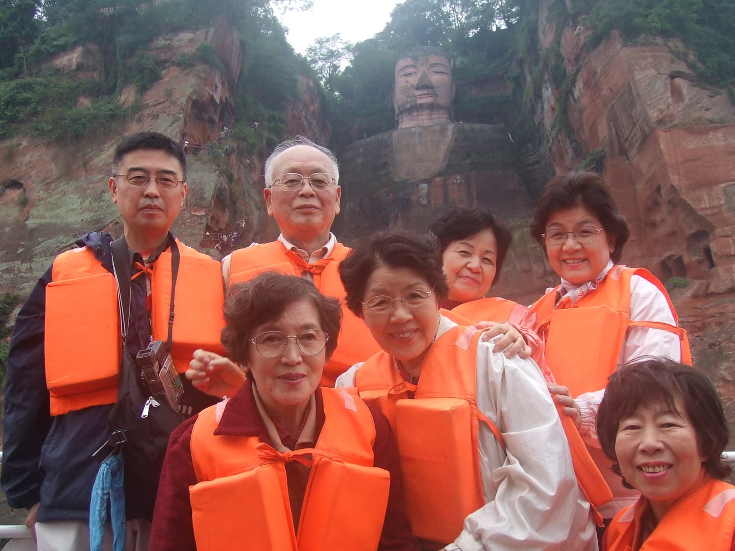 目いっぱいが売りの旅。日中分刻みでウロウロして夜もなお頑張ります。四川名物「川劇(センゲキ)」。劇中のメインは瞬時に仮面が変わる「変臉(ヘンレン)」で、仕組みは一子相伝、秘伝とのこと(写真2)。翌朝からは成都を一旦離れ世界遺産「楽山大仏、峨眉山」へ。途中「黄龍古鎮」に立寄りました。露店の花屋で買った花冠を被って奥様との記念撮影です(写真3)。世界遺産に指定されると規制が多くなり「昔はこうだった!」という話になりがち。先生には「大仏には直接登れません。河から船で見物です」とご説明させていただきましたが、本当に残念そうにされていたことを思い出しました。大仏は世界最大で最長の石像。東大寺大仏の5倍の大きさがあるとのことです。全体を拝むには全面を流れる長江の支流「岷(ミン)江(コウ)」と数本の河が合流する激流地点に船を浮かべます。当然揺れが大きいのですが、大仏のその大きさに圧倒され船酔いする人はいなかった?と思います(写真4)。