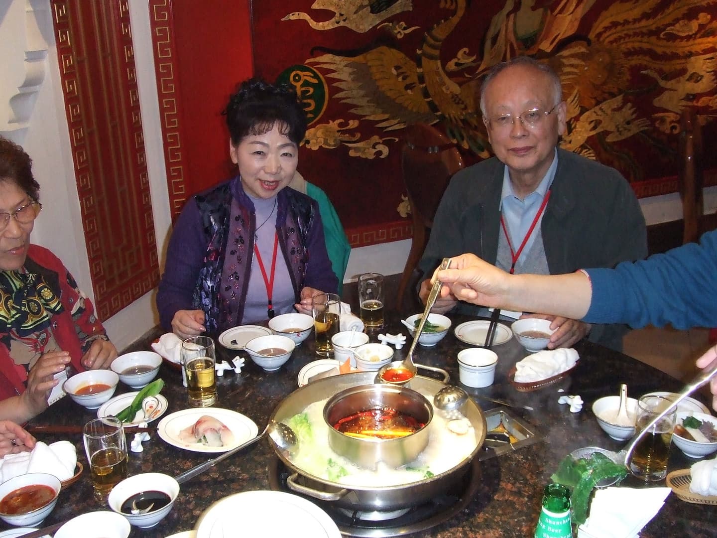 が、おかげで目的地最後の夜、重慶の到着時間はズレにズレ、江沢民も訪れたという火鍋の名店では、我々のためだけにやたら広い店を閉められずに待っていました(写真4)。ホテル着が22時。翌朝出発は5時半。急遽ホテルが朝食の弁当を作ってくれて、上海行の飛行機に飛び乗る始末。でも皆さんお元気。豫園に行きまだまだ観光&買い物。今なら絶対こんな危険でしんどい計画ヨ~組みません。浦東空港に無事着いてガイドの王さんが「ホッとした」と言ったのを思い出しました(写真5)。