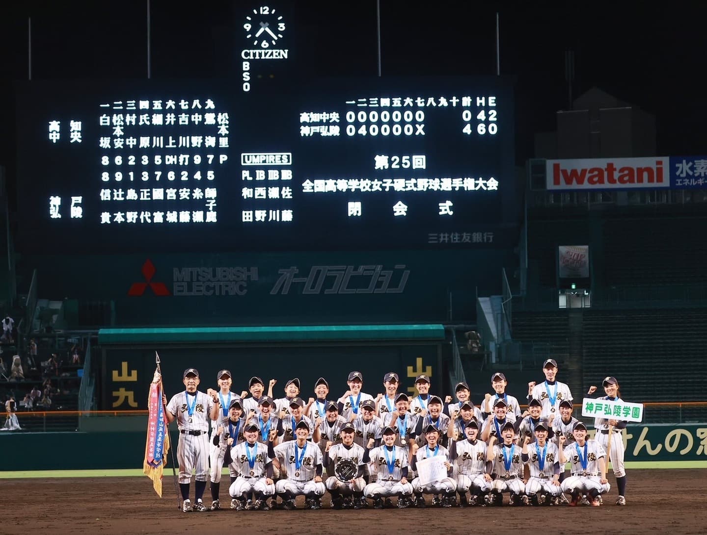 オリパラに沸いた夏。これまた歴史的な出来事。場所は高校野球の聖地甲子園です。男子の大会10日目の夕方5時から、第25回女子硬式野球大会の決勝戦が開催されました。現在全国に40校あるという女子高校硬式野球チームの頂点を聖地で史上初めて決めようというのです。高知中央との戦いに決着をつけたのは神戸弘陵学園。と、ここまで書いて「野球ってどこまで迷走するの?」と、無理もありません。でももう少し我慢してください。優勝校の石原康司監督は過去に同校男子チームの監督として2度甲子園に出場した名将。史上初めて男女チームを甲子園に連れてこられたのです。と書いてここからが本題。普段は同校書道科の先生。そして最後は「翠雲」の雅号で活躍される書源誌の誌友なのです。コロナ対策で応援席に生徒も入れない状況の中、無理を承知でお願いして、特別に観戦させていただきました。ナイターの甲子園で、野球が好きで仕方のないJKたちのプレーは明るく、力強く、引き込まれます。機会があれば是非観戦、応援ください(写真1)。