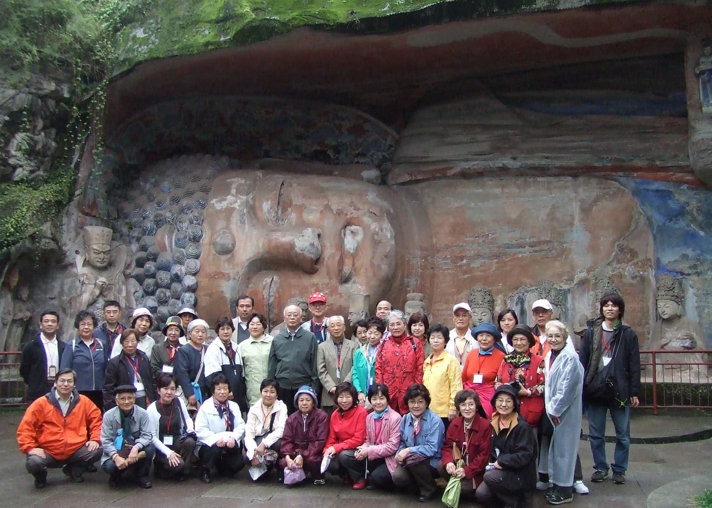 峨眉山を後に再び成都へ。微妙に予定時間が狂い始めます。記録では14時の下山が17時前になっています。翌日の重慶へは「高速道路ばかり」と甘く見たのが大間違い。途中寄った土産物店。今回初!そして明日夜はもう日本!人数は約40名。ニタリと笑う土産物屋にヒキツル我。それはエライ事でした。巴蜀の都成都を漸く後にして、向かうは世界遺産「大足(ダイソク)石刻」です。世界遺産登録後経過時間が短く資料も少な目「大したことなく終われる」と思ったのがまたも失敗。今となってはこんな世界遺産を観られることはないでしょう。石刻の入口は粗末な鉄の扉で、簡単な鍵を職員が掛けているだけ。ほぼむき出しの石刻は触りたい放題です。それだけに皆さんのテンションは上がります。文革の影響が全く無く、ほぼ完全な状態で残されたのは何よりも人里離れた辺鄙な場所にあったことだとか。全長31㍍の釈迦涅槃像は圧巻です。感動に包まれ出発が惜しまれ、閉門時間を過ぎてまでこの地に留まりました(写真2,3)。